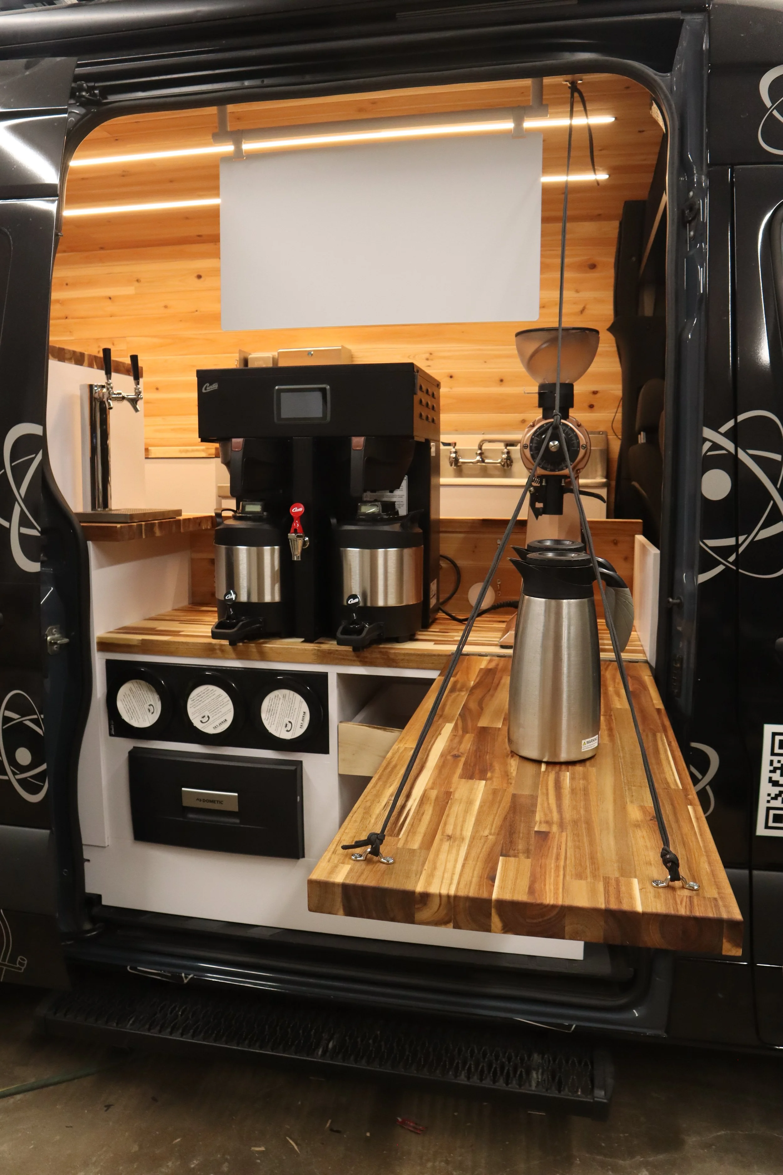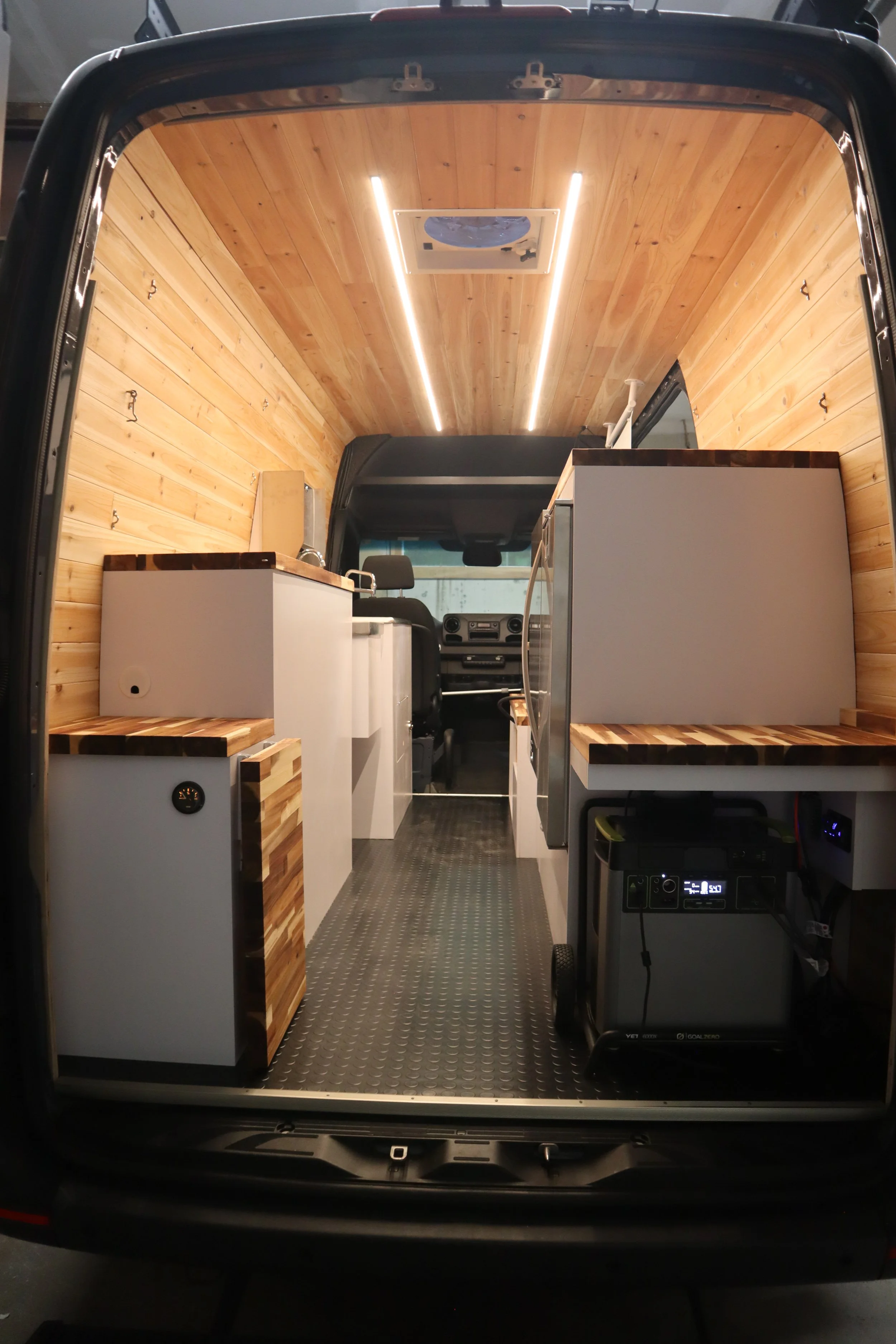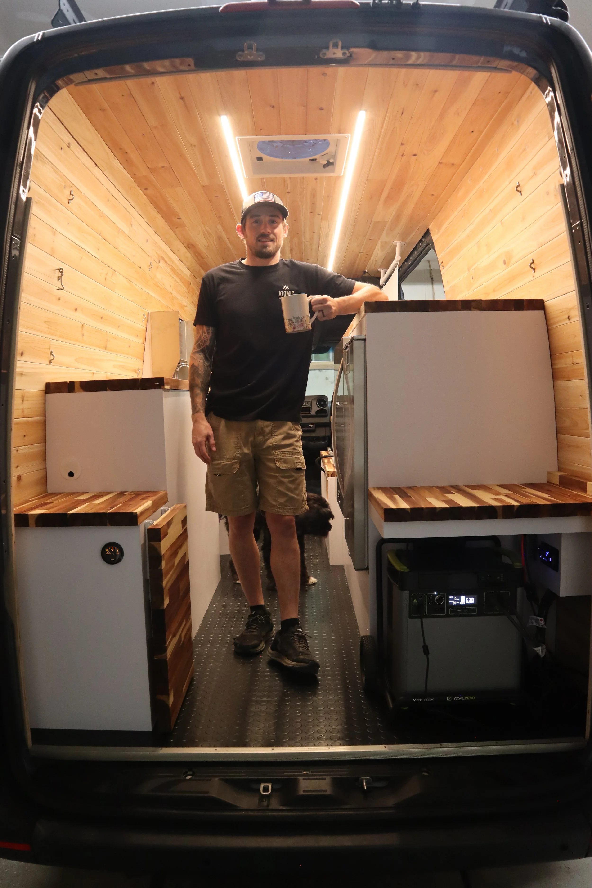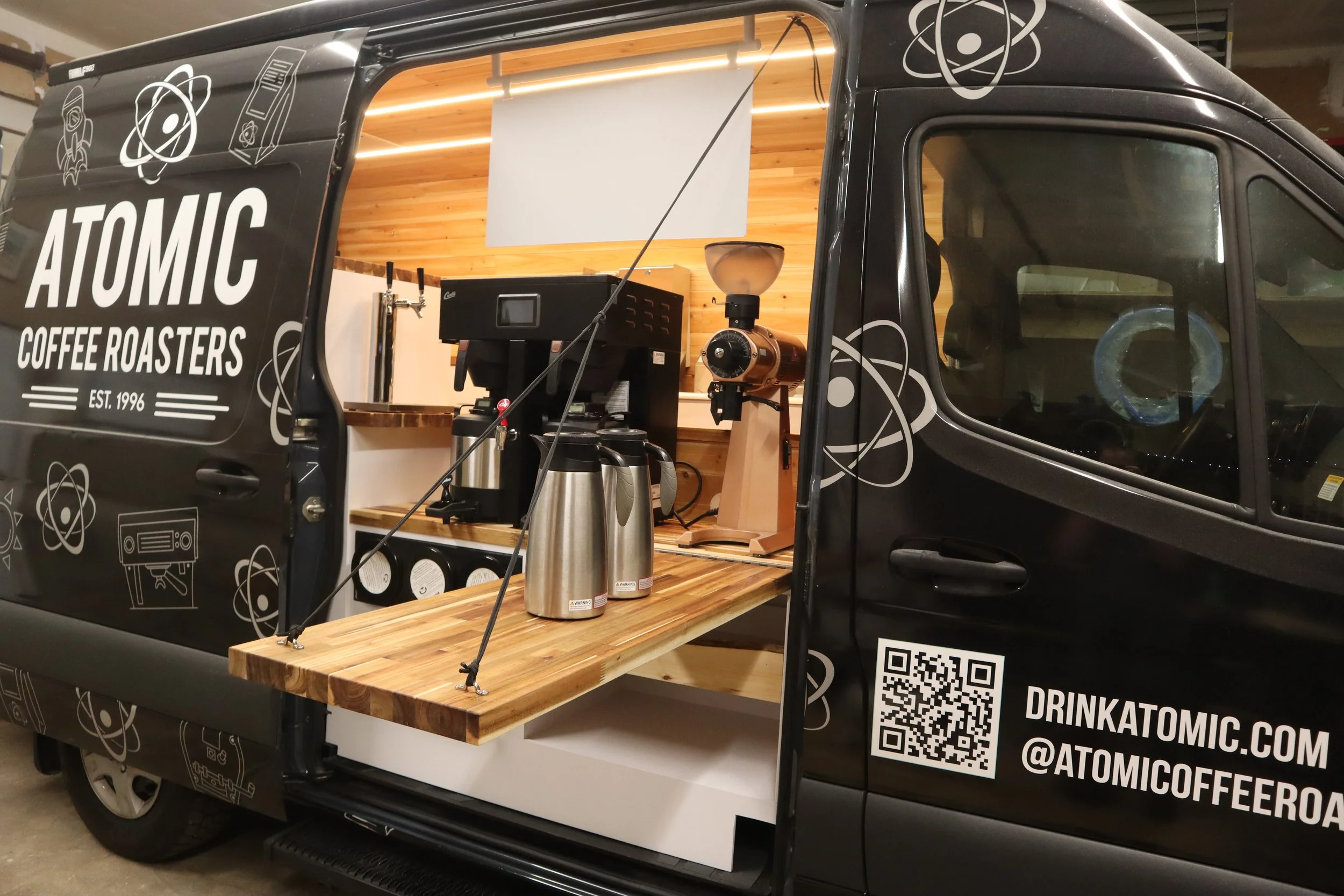 This project highlight was a tailor-made coffee van build for Atomic Coffee. This was a solo build that took 2.5 months to complete and included custom cabinetry, butcher block counter tops, cedar plank walls, a 25 gallon fresh water tank, and a 6,000 Watt Hour portable Goal Zero Battery.
